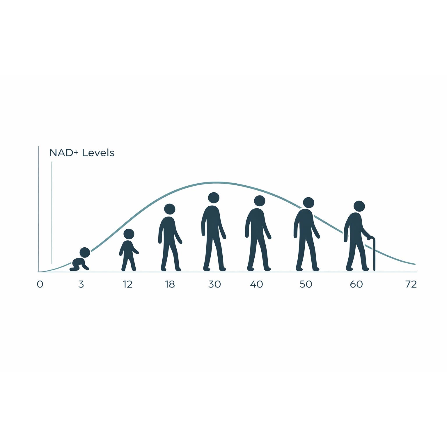 NAD⁺ er et koenzym som finnes i alle celler. Det er avgjørende for energiomsetning, DNA-reparasjon, cellefornyelse og aktivisering av sirtuiner - proteiner som er koblet til lang levetid. Når vi blir eldre, faller NAD⁺-nivåene naturlig, noe som påvirker energi og helse.